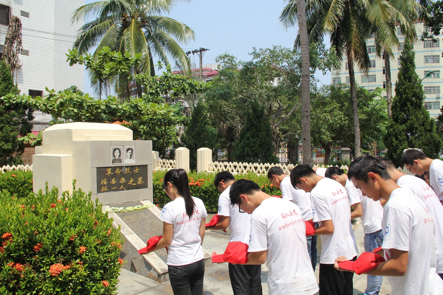 带着对革命烈士无比敬仰的心情,寻访团来到了红色娘子军纪念园,认真瞻仰了红色娘子军雕像,仿佛看到了红色娘子军老战士当年叱咤风云的光辉形象。同学们跟着解说员走进纪念园内,脚穿草鞋、肩背竹笠女战士的雕像,展现了一代巾帼英雄的气概。园内以时间为脉络描述了一百多名穷苦的女孩子,为反抗封建压迫和争取男女平等,在党组织的领导下,勇敢地拿起了枪。他们在中国琼崖特委的领导下,出色的完成了保卫领导机关,宣传发动群众等任务,并配合主力部队作战,在伏击沙冒岭、火攻文市炮楼等战役中,不怕牺牲,英勇杀敌,后受国民党“围剿”被迫解散,散落于民间。抗日战争时期,受红色娘子军精神的影响,琼崖妇女拿起枪杆子参加抗战,为抵御侵略立下不朽功勋。岁月流逝,硝烟远去,但红色的传奇仍在海南岛这片热土上延续。接着,寻访团来到了周士第将军纪念馆,馆名由江泽民题写,位于琼海市嘉积镇不偏岭。进入馆内,讲解员极其生动寻访团讲述,周士第将军从黄埔军校毕业后,领导“铁甲车队”保卫广东革命政权,参加“北伐战争”和“南昌起义”,随红军大部队长征,协助张学良和杨虎城防御国民党,抗日战争一同指挥取得平型关大捷,为建设和巩固晋绥抗日革命根据地做出重大贡献,可谓是功绩着千秋,热血铸军魂!随后,寻访团到杨善集烈士纪念亭,全体成员向杨善集烈士及夫人林一人鞠躬默哀,表达缅怀之情。
