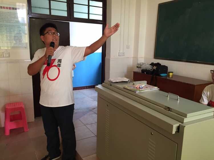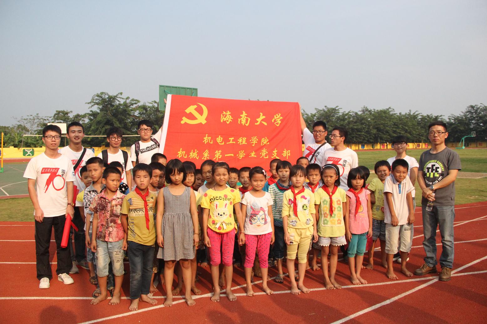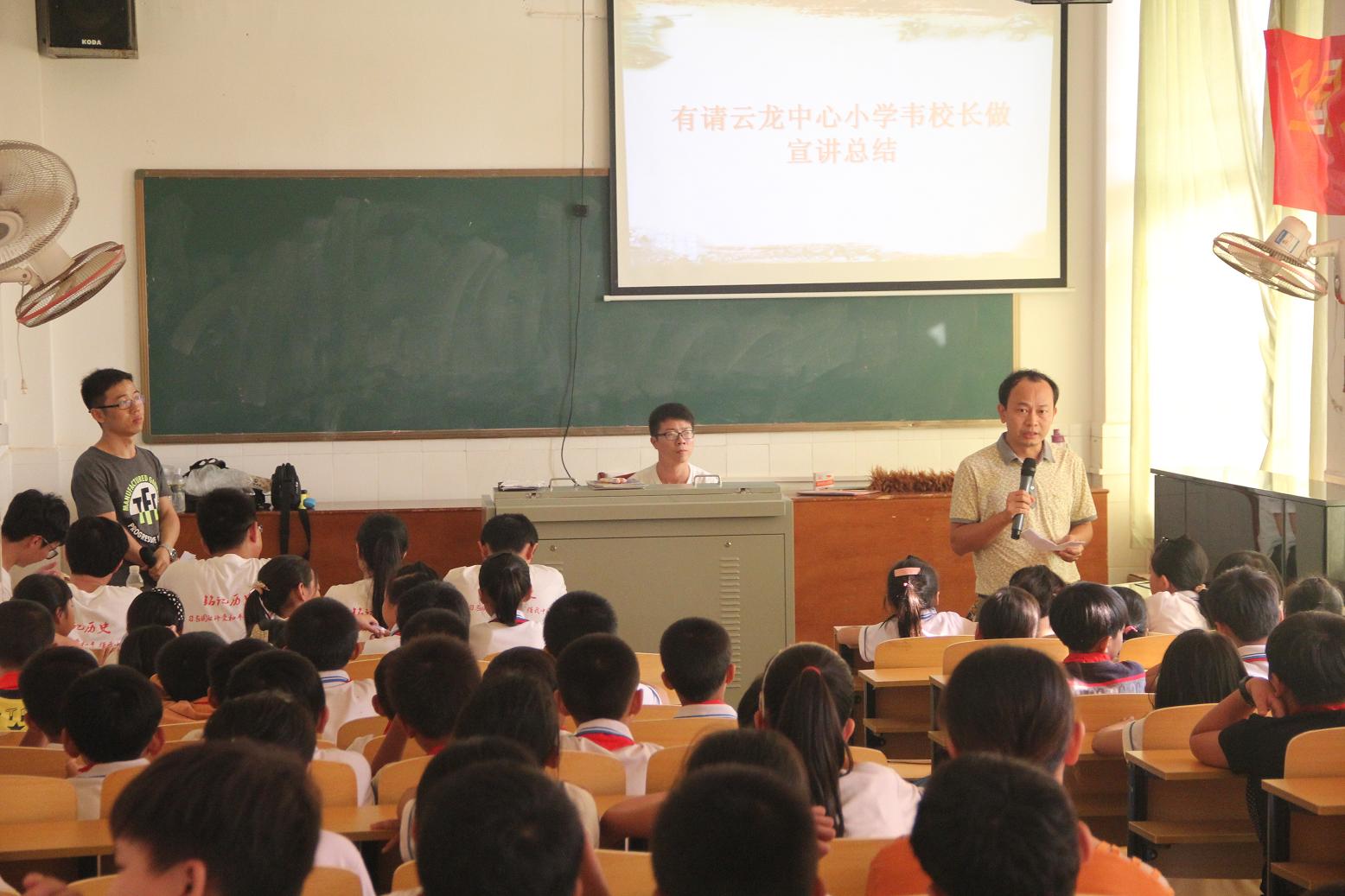 下午两点三十分,团队成员准时到达云龙中心小学,在该校韦副校长的帮助下,参加活动的100多位同学有序地进入会场就坐后,活动顺利开始。活动开始前,团队成员为同学们播放了前期制作的视频《全国大学生纪念抗战胜利70周年寻访活动》,视频具体围绕抗战胜利七十周年展开,逐步将主题引入抗战时期的海南战场,进而引出本次宣讲活动的主题——“铭记历史、圆梦中华”,视频结束后,团队代表团队代表朱凯峰、起家林等六名同学分别就本次暑期社会实践活动中印象最深的一位抗战老兵的故事与同学们一起交流,团队成员以生动的言语,将张云逸大将、远征军云昌舜等人的抗战光荣事迹讲给同学们听,使同学们对抗战有了更加深刻的记忆与体会。