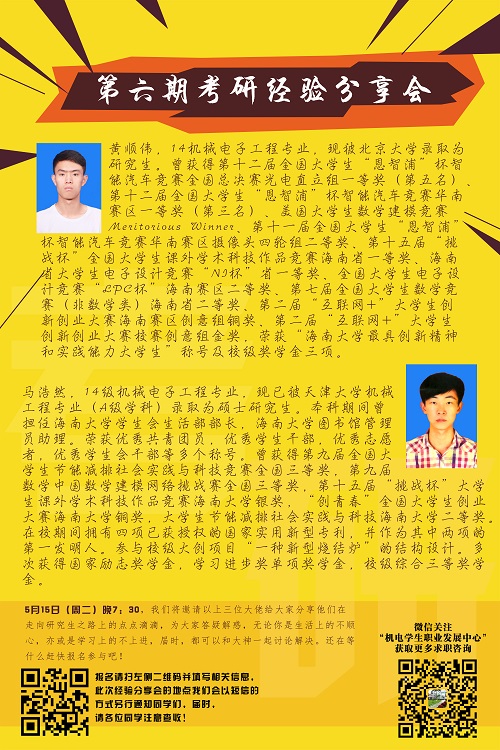 为帮助同学们明确考研备考思路,确立科学复习规划, 金年会jinnianhuicom于2018年5月17日晚7:30在研发楼417,成功举办了第五期考研经验分享会。出席分享会的有考取北京大学的黄顺伟和考取天津大学的马浩然两位学长,参加分享会的有十余名想了解考研相关知识的同学,会议由职业发展中心的韩圣主持。