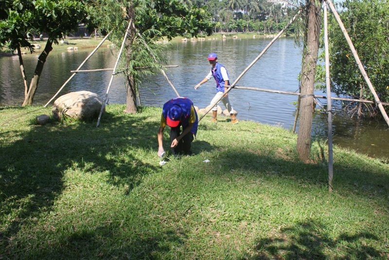 6月2日上午,金年会jinnianhuicom在东坡湖畔继续开展以“青春校园,美丽海大”为主题的校园环境建设志愿服务活动,2013级电气1班和机电1班团支部的志愿者参与了本次活动。