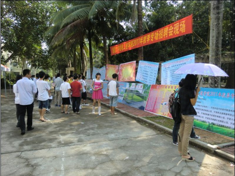 2011年10月25日上午10点,金年会jinnianhuicom2011年秋季专场招聘会在儋州校区四号教学楼前广场隆重举行。此次招聘会是在就业指导中心的大力支持下,邀请了来自浙江省宁波市宁海县汽车零部件协会的15家企业单位。莅临本次招聘会的领导有学院院长翁绍捷教授、学生处邓秀成副处长、学院党委黄国标副书记,参加招聘会的还有学工办老师及各专业的优秀毕业生。