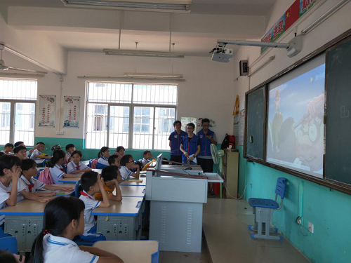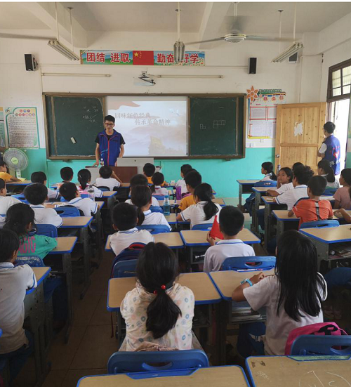 支部成员们在下午14:30从金年会诚信信誉至上北门乘坐大巴出发,前往大林小学。海南的四月,虽然天气异常炎热,党员们却热情不减。在课堂上,支部成员们首先通过有奖知识竞答的方式,生动有趣地为同学们介绍了什么是红色精神、五四爱国运动、红色经典与革命精神,随后播放了相关的视频引导同学们一起探讨学习。支部成员们共同表演了以“五四爱国运动”为主题的话剧,再一次带领大家体会这场具有里程碑意义的革命运动中,爱国青年们勇于奉献,不怕流血牺牲的伟大精神!