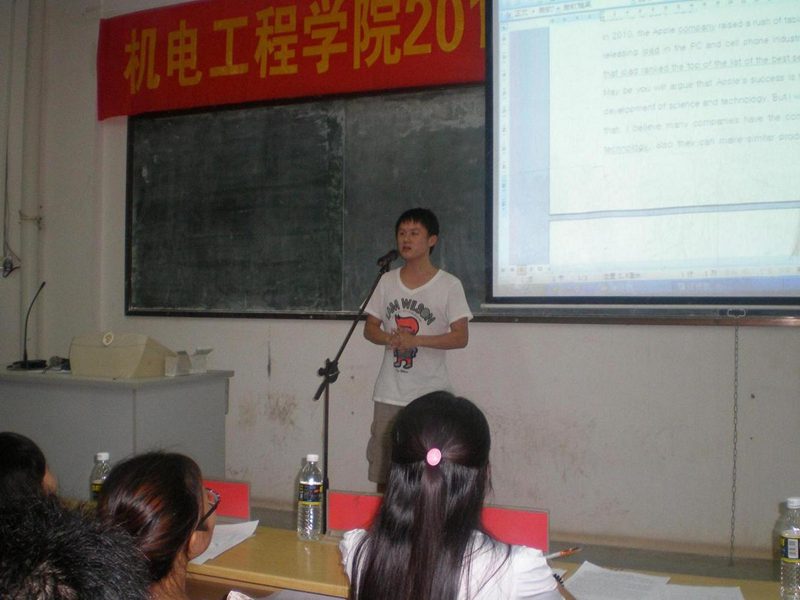 现场气氛紧张热烈,从第一位选手演讲的“smile has changed the world ”到最后一位选手演讲的“A word that has changed the world ”,教室里慷慨激昂的演讲声,一次次的引起了在场同学们热烈的掌声。中场互动时,主持人给现场观众出了英语趣味问答题,观众积极抢答,让现在紧张的气氛得意放松。经过激烈角逐,最终09机电1班刘骏以最高分获得第一名,09机械1班陈阳获得二等奖,09交通1班汪雨航、09车辆1班陈曦、08农机2班杨晓伟获得三等奖。