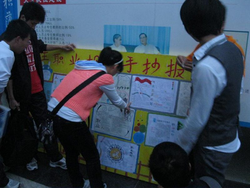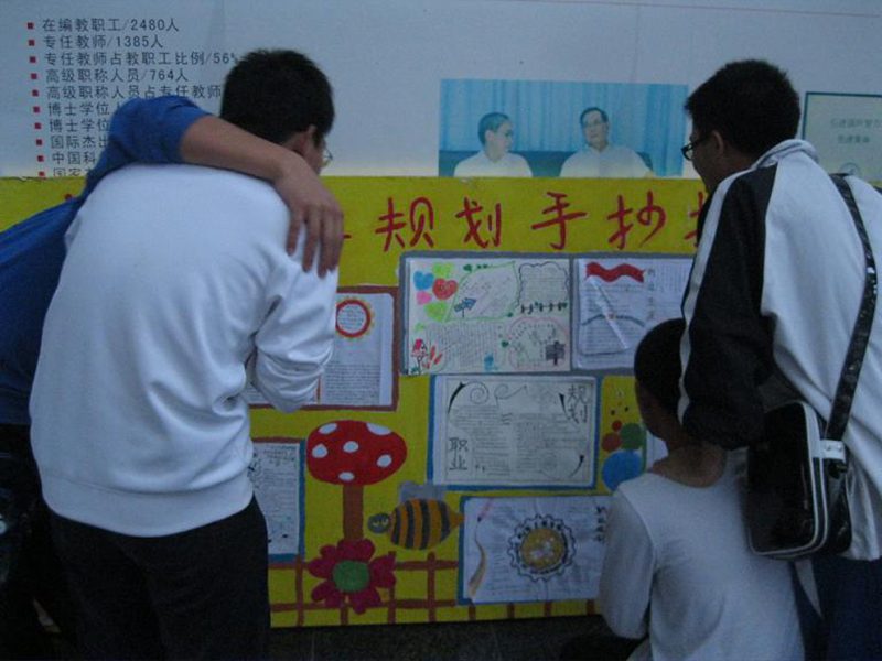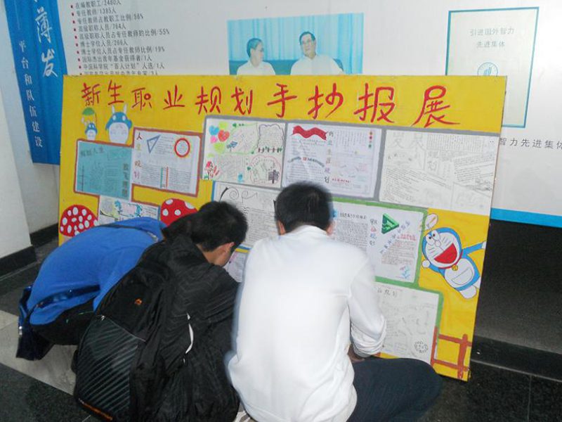2011年11月20日,金年会官网在3号教学楼前展出2011级新生“我画我规划”职业规划手抄报优秀作品,引来学子们饶有兴趣地驻足观看。