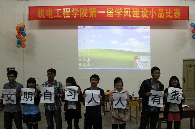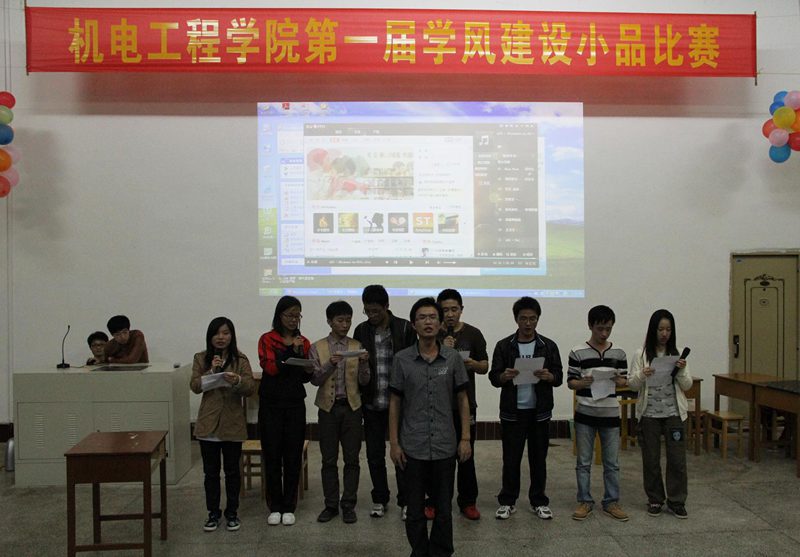 此次比赛分两组进行。首先上场的是09机械2班,他们表演的从一个侧面反映了大学学习中存在的一些问题,以幽默的对白给大家以警醒,你一言我一句带动了现场气氛,为比赛开了好头。之后上场一系列小品更是引起现场笑声连连。机械系党支部准备的小品,演绎了现在极少学生整天沉迷游戏,考试过程中作弊的场景。告诫同学们考试不能作弊,平时要努力学习才能考出好成绩。尤其是由09电气1班带来的小品集幽默的语言和夸张的舞蹈于一体,将比赛现场的气氛推向高潮,全场掌声雷动,延绵不绝。告诫同学们我们不能忘来大学的目的,时刻不要忘了学习,不要辜负父母、老师及社会对我们的期望。09电气2班的,讲述的是一名大学生丢弃了理想,随波逐流,在舍友的鼓励下,重拾理想,为自己未来蓄势待发。