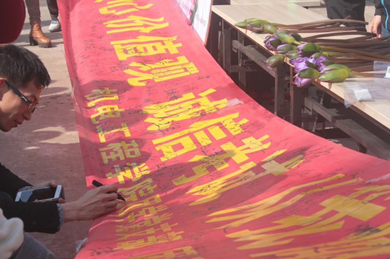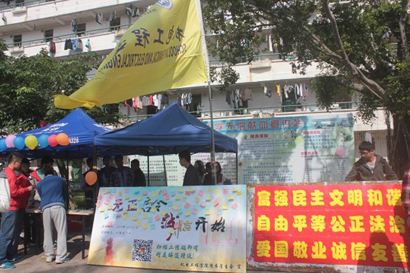 本次倡议活动由金年会jinnianhuicom团学党支部、团委学生会负责。当大地还在沉睡,团学干部们一早起床为今日活动做好准备。“践行社会主义核心价值观,诚信考试,从我做起”这道横幅成为今天校园内最亮丽的一道风景。签字活动吸引了大批行人的驻足与询问,大家严肃庄重的签上了自己的姓名,签字后均有一束蓝莲花赠送。大家纷纷表示将会以身作则遵守校规,诚信考试。