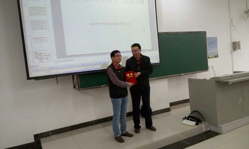 2014年1月15日,海南钧达汽车饰件股份有限公司副总经理、高级工程师陈家涛应邀来金年会官网对2012级车辆工程、交通运输专业进行冬季小学期授课,唐荣年副院长主持了开课仪式,并为陈家涛副总颁发了冬季小学期授课专家聘任证书,汽车系主任李劲松副教授等教师也参加了讲座。