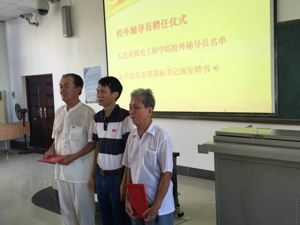 黄国标书记向学院特聘校外辅导员王荣、程儒参教授颁发聘书