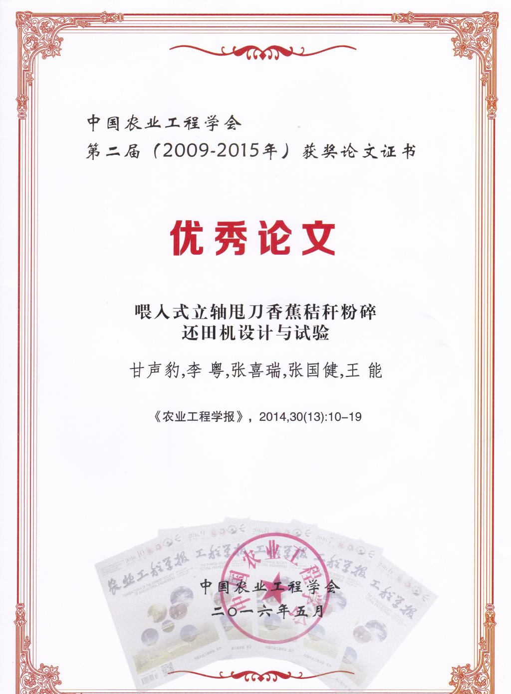 近日,金年会官网热带作物秸秆机械化技术课题组两篇《农业工程学报》论文入选“中国农业工程学会第二届优秀论文”。两篇论文分别是“滚割喂入式卧轴甩刀香蕉假茎粉碎还田机设计与试验”(通讯作者:张喜瑞副教授)、“喂入式立轴甩刀香蕉秸秆粉碎还田机设计与试验”(通讯作者:李粤教授)。继2009年中国农业工程学会第一届优秀论文评选后,中国农业工程学会今年启动了第二届优秀论文评选。本届优秀论文评选范围是《农业工程学报》2009-2015年刊发的论文,优秀论文遴选采用文献指标定量与发表时专家评审意见定性相结合,提出候选论文,由中国农业工程学会组织专家评审。