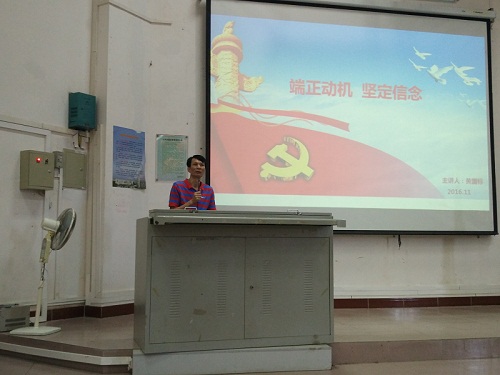 2016年11月6号上午,金年会jinnianhuicom分党校第二期党员发展对象培训班第五讲由学院党委黄国标书记讲授《端正动机,坚定信念》,培训班班长尹凡主持本次培训学习。参加本次党课的有本期发展对象和积极分子。