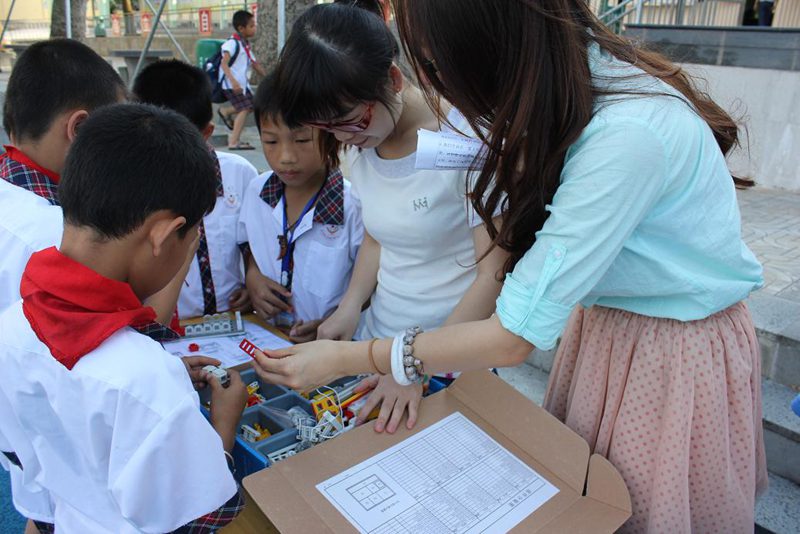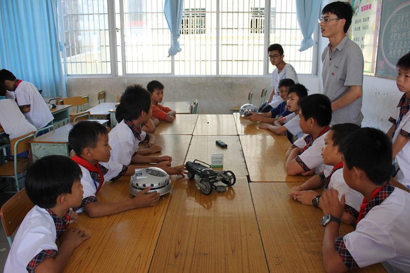 在多媒体教室,首先科技服务团成员高建伟播放一些有关制作机器人的视频,并向小学生们宣讲实践动手的重要性。高建伟向同学们演示了机器人的拆装步骤,并着重强调了过程中的注意事项。同学们认真仔细地观察,并不断的记忆;接着,科技服务团成员将学生分为12组,每组由4到5名同学及科技服务团一名老师组成。随后,科技服务团老师把学生带到指定的场地,指导同学们自行拆装机器人,同学们不断尝试和改进,直到自己亲手组合成功。