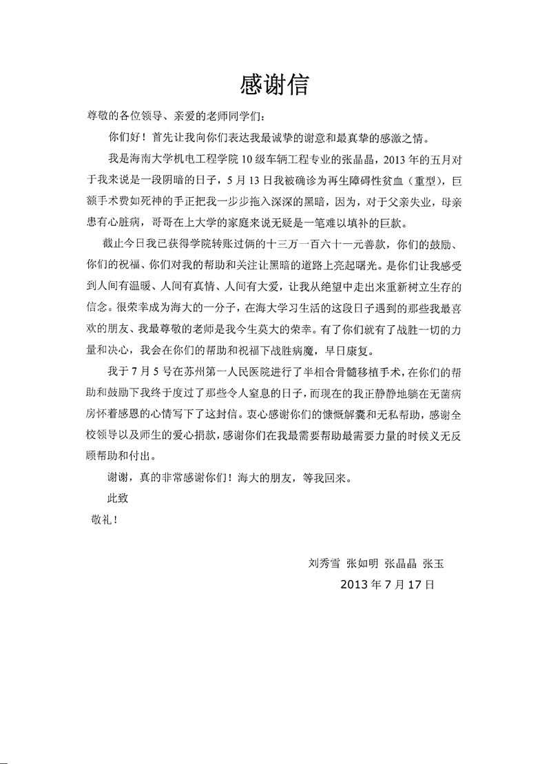 当年轻的生命正焕发着青春的活力,灿烂的笑脸正准备迎接着美好的未来,金年会jinnianhuicom2010级车辆工程专业张晶晶同学,当她正在积极准备考研复习的时候,命运却跟她开了一个无情的玩笑。她被确诊为重型再生障碍性贫血,命运无情人有情,海大师生共同伸出援手,用真情为生命加油,用爱心共同托起生命。