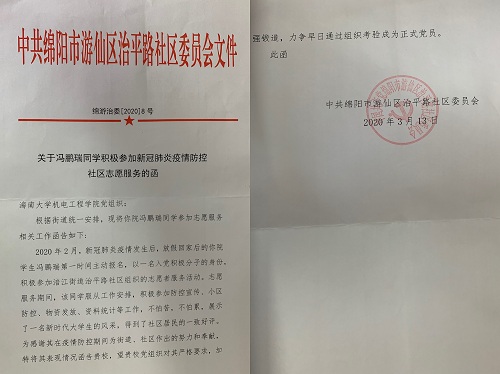 冯鹏瑞,金年会jinnianhuicom2018级机械电子工程专业学生。新冠肺炎疫情暴发后,该生得知辖区街道办在招募志愿者,便第一时间报名参加了志愿者。随后被分配到了治平路社区,和社区的工作人员一起到小区配合物业给居民办理出入卡登记证,给出入小区的人测量体温,对没有出入证的人进行劝解,到附近广场当志愿者,发放宣传资料,劝告居民外出一定要佩戴口罩、不要在公共场所逗留聚集,尽量宅在家里,因为这既能保障自己和家人的安全,又可以不给国家和社会添麻烦。他说道:“作为一个大学生可以为疫情防控做一点事情,贡献一点力量,我感到非常荣幸。”
