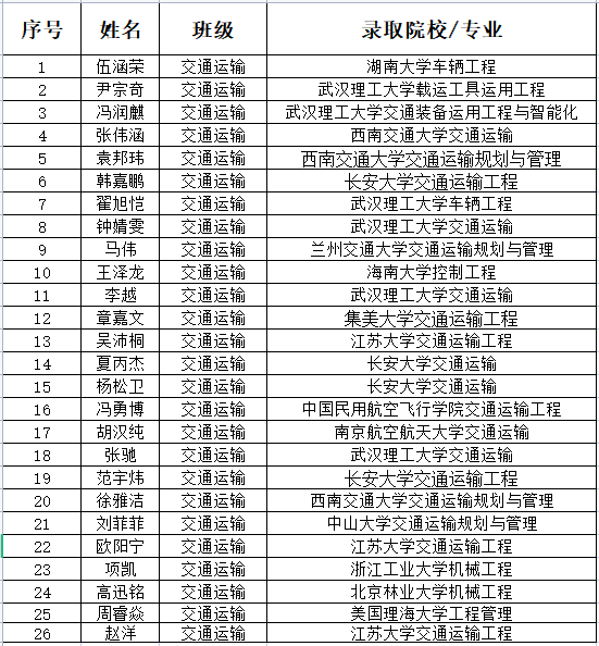 又是一年毕业季,2022年研究生复试录取工作已经接近尾声,金年会jinnianhuicom考研喜报频传,其中,2018级交通运输本科毕业生录取情况喜人,交通运输班共有应届生51名,有26人保研或者考研成功,考研录取率为50.98%,较2021年同比增长19.98%。其中有20人被湖南大学、南京航空航天大学、西南交通大学等“双一流”高校录取为硕士研究生。