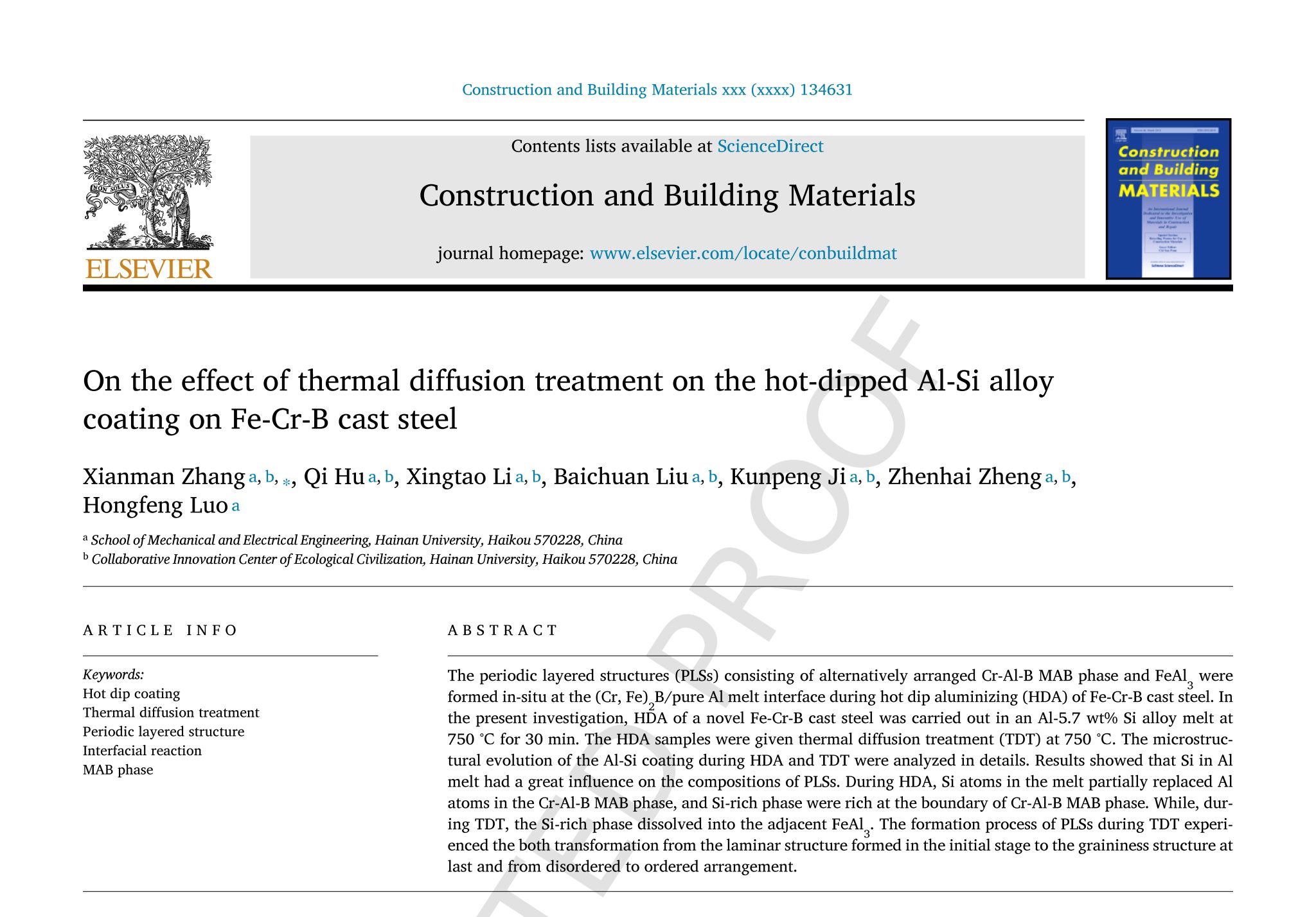 近日,金年会jinnianhuicom清洁能源高效存储材料与装备团队在Fe-Cr-B铸钢热浸镀铝方面取得系列研究进展,相继在《Ceramic International》(IF5.2,SCI一区Top期刊)、《Construction and Building Materials》(IF7.4,SCI一区Top期刊)国际权威期刊上发表论文,张先满副教授为论文的第一作者兼通讯作者。