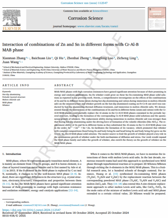 其他两篇论文(Spontaneous growth of Sn whisker on the hot-dipping Al–Sn alloy coating on Fe-Cr-B cast steel, Materials Characterization 214 (2024) 114116; Does Sn2+ play well with Zn2+ as their molten chloride salts react with Cr–Al–B MAB phase? Solar Energy Materials and Solar Cells 276 (2024) 113086)则分别揭示了Fe-Cr-B铸钢热浸镀Al-Sn合金和Al-Si合金及后续SnCl2、ZnCl2熔盐腐蚀后诱发晶须生长及其机理。
