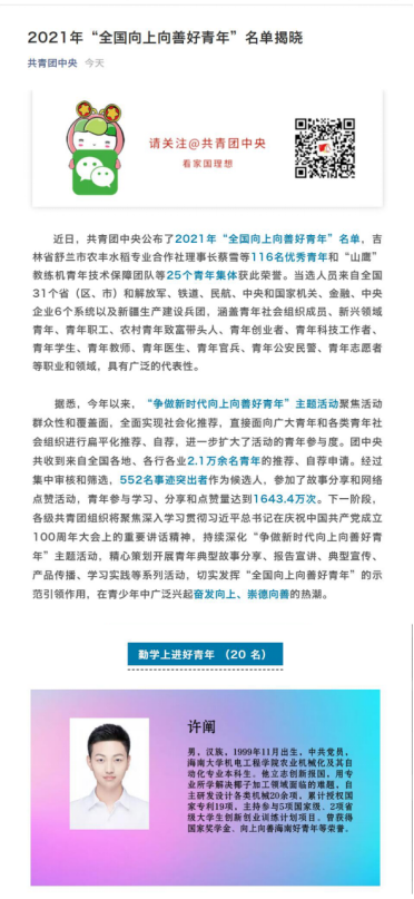 喜报 | 热烈祝贺致远班四期学子许阐获得“ 2021年全国向上向善好青年”称号!!